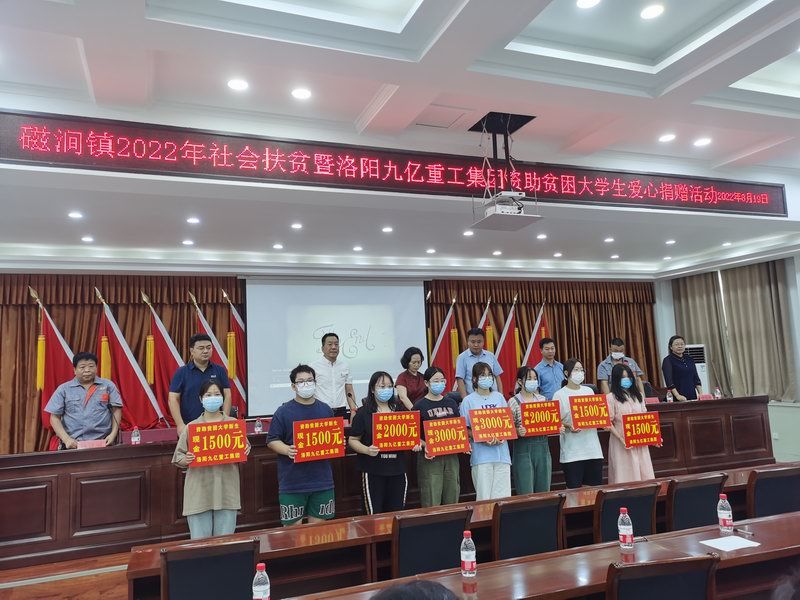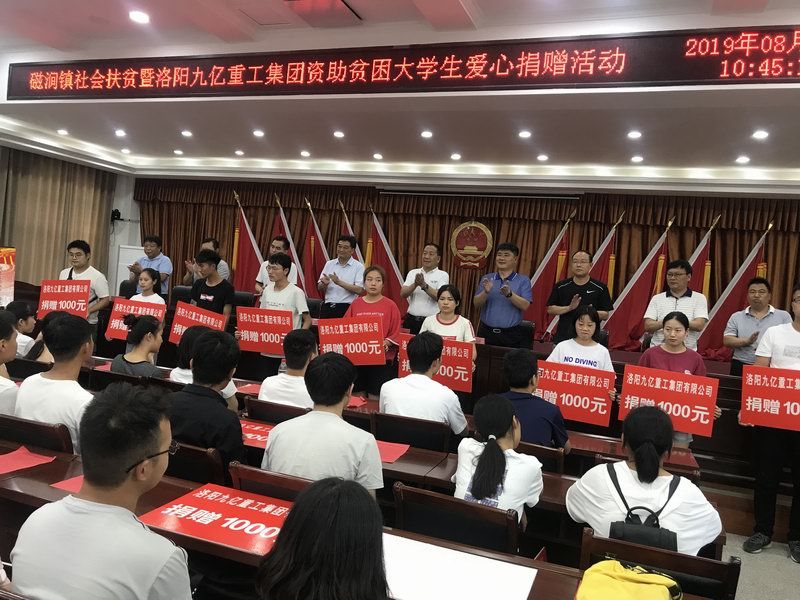 愛是與生俱來的,在血液里流動,在骨子里結晶,它源源不斷的由心而生,永不枯竭,只要人人都愿意奉獻一點愛,就如甘霖沐浴大地,人間處處盛開幸福之花! 為響應洛陽市政府精準扶貧政策,洛陽九億重工集團有限公司及董事長王九茂積極參與捐資助學的慈善義舉活動,特做出如下決定:1、公司幫扶磁澗鎮(zhèn)2017年新招貧困大學生21名順利入學,每人資助2000元,總計肆萬貳仟元整; 2、總經(jīng)理王九茂(縣政協(xié)委員)以個人名義資助磁澗鎮(zhèn)南窯村2017年新招大學生6名,總計12000元整; 我相信,在社會各界的大力支持和共同努力下,我們的“愛心助學”活動將會惠及到更多的同學,為了夢想,刻苦讀書、報銷祖國,廣大同學也一定會在溫暖的社會大家庭里茁壯成長,必將成為國家建設的有用之才! 洛陽九億重工集團有限公司 董事長:王九茂